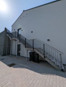 Mitte August wurde endlich das lang erwartete Geländer an der Außentreppe hinter dem Gebäude montiert. Dieses Geländer war der letzten offene Punkt für die brandschutz-rechtliche Abnahme des Gebäudes, welche wiederum die Grundlage für die Nutzungsaufnahme des Gebäudes darstellte.