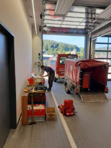 Auf dem linken Foto links zu sehen, wurde ein zusätzliches Feld angebaut. Hier soll der Kompressor manipulationssicher untergebracht werden. Dieser soll nächste Woche geliefert werden. Er dient vorrangig dazu, die Einsatzfahrzeuge mit Druckluft zu versorgen, um Zeitverzögerungen beim Ausrücken zu vermeiden.