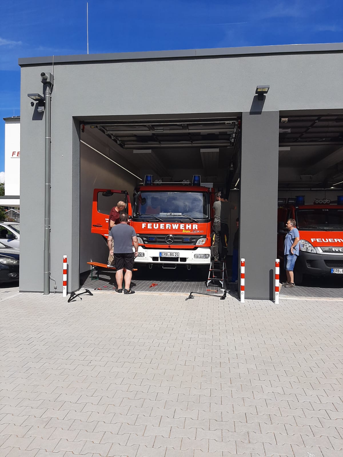 An den einzelnen Stellplätzen wurden in Eigenleistung Ladegeräte sowie Kabel und Druckluftschläuche für die Einspeisung der Feuerwehrfahrzeuge angebracht.
